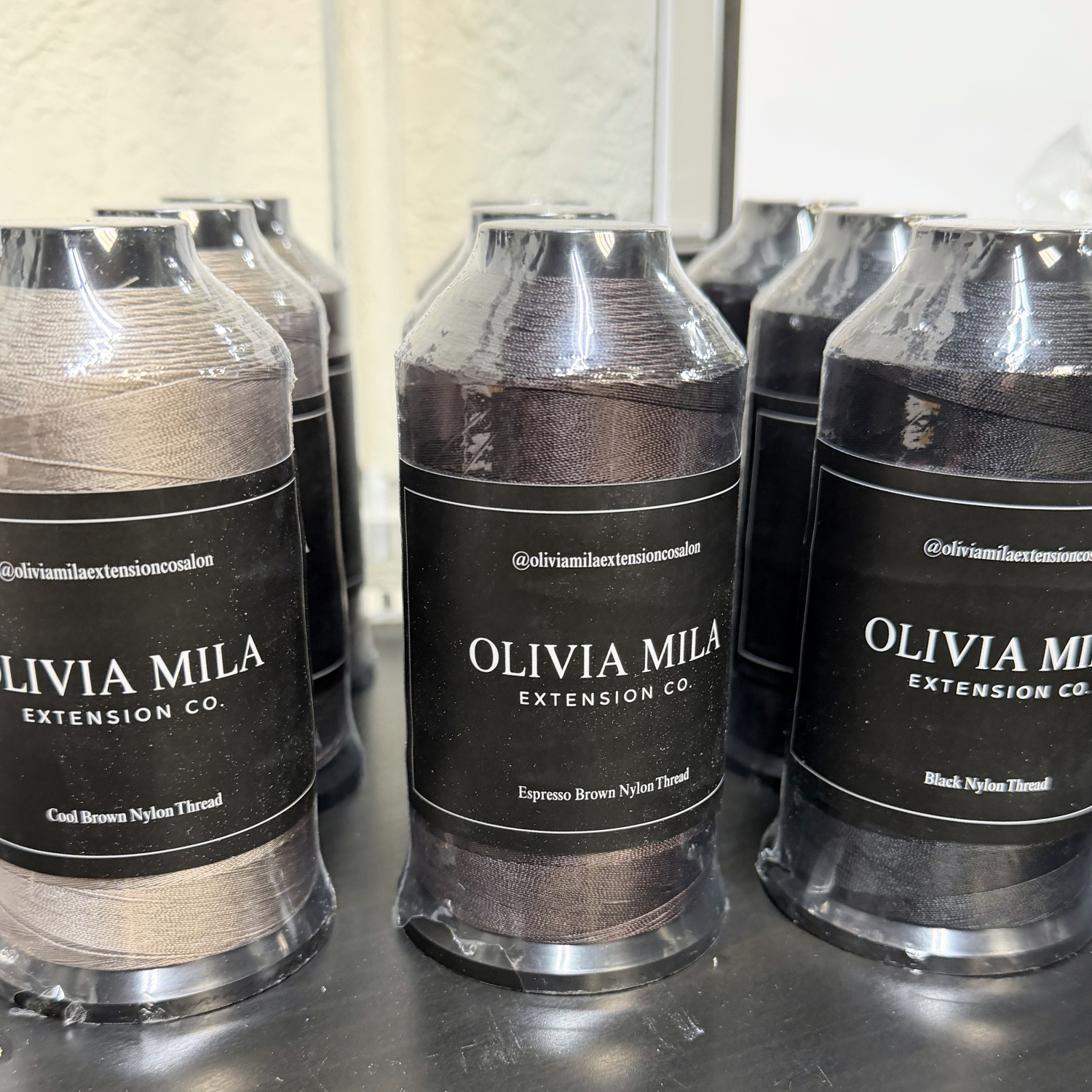 Olivia Mila Nylon Thread. Measuring 1500 yard, nickel-free string is made with premium nylon thread for strong, smooth stitching without friction. Nylon is moisture-resistant, unlike cotton thread that can retain moisture and cause mold, making it ideal for long-lasting extension installs. When paired with Olivia Mila C-curved needles, it allows for a flat, seamless stitch that lays beautifully against the hair. Each color is sold separately.